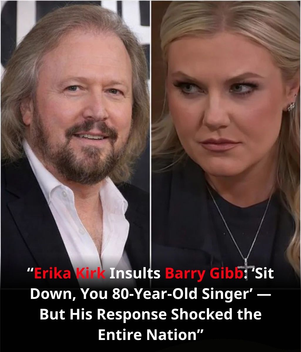 What had begun as a formal event shifted in tone the instant Erika Kirk spoke. Her words were sharp, dismissing Barry Gibb with the cold suggestion that an “80-year-old singer” should simply sit down. For a moment the auditorium seemed to lose its breath. Conversations stopped. Even the soft rustle of the crowd faded into uneasy silence.