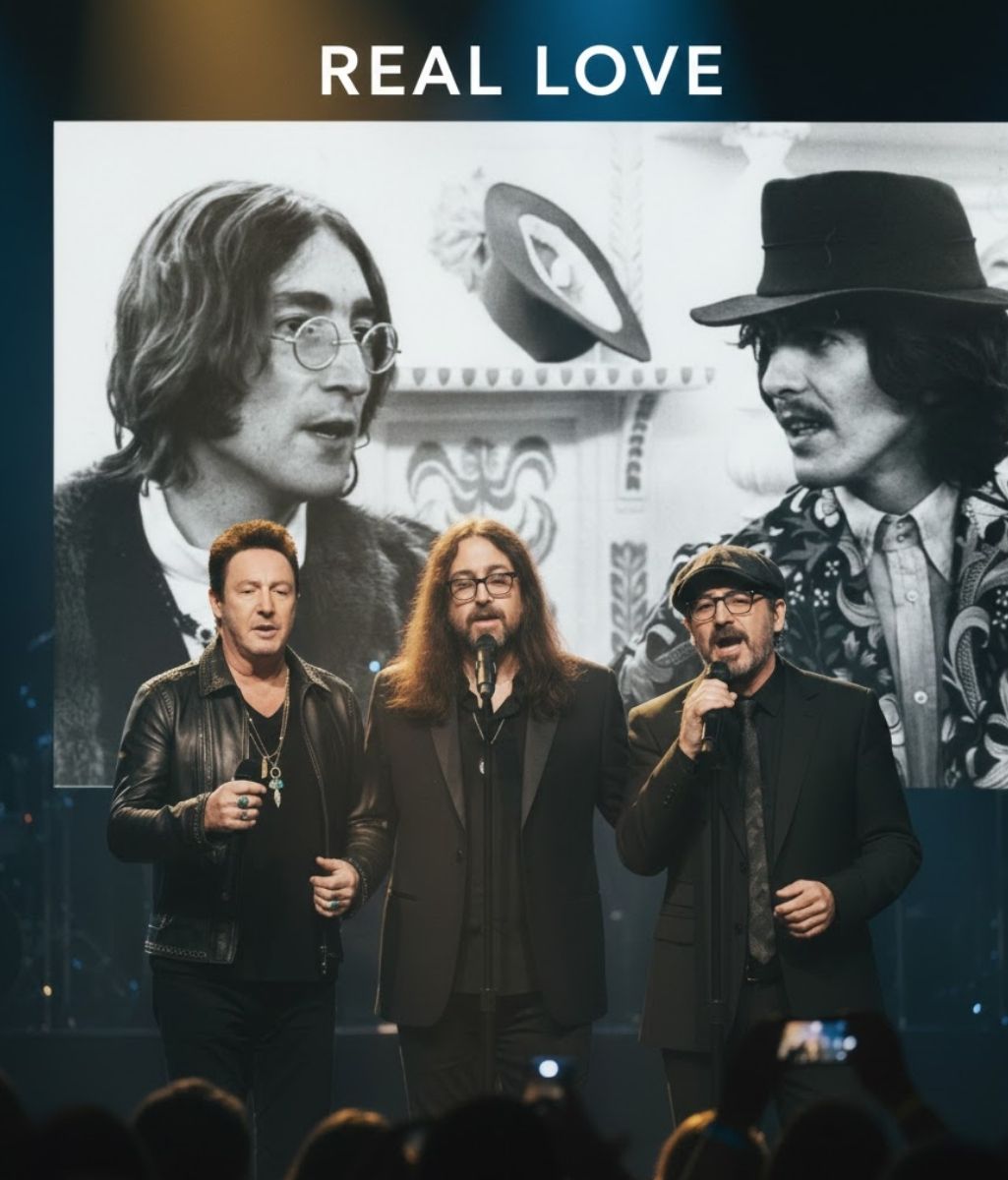 The lights dimmed with unusual tenderness as three figures stepped into view. For a moment, the room seemed to forget where it was. Sean Lennon, Julian Lennon, and Dhani Harrison stood shoulder to shoulder, not as the descendants of history, but as sons carrying something fragile, sacred, and deeply personal.