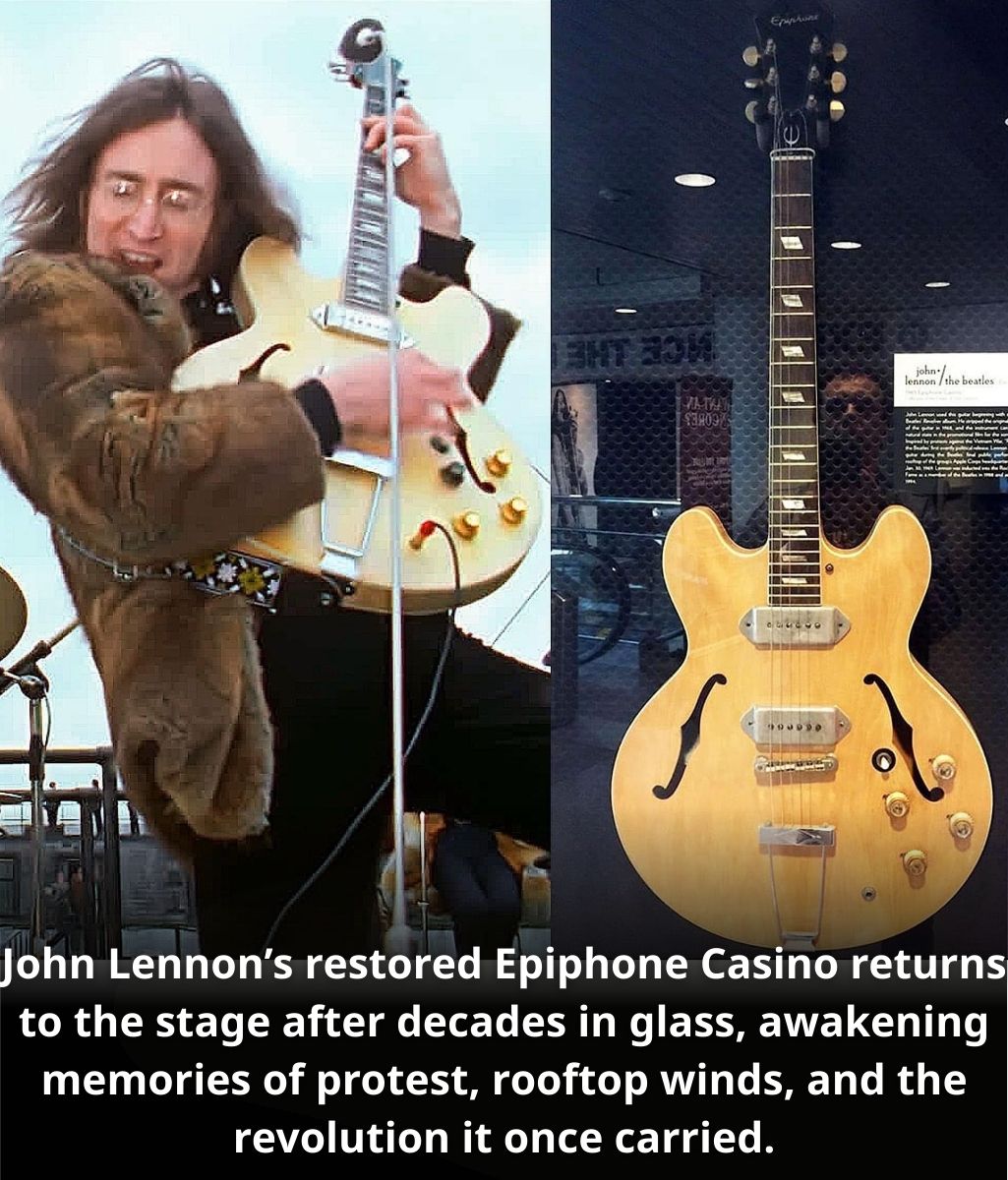 John Lennon’s 1965 Epiphone Casino — the same guitar stripped down for “Revolution,” the same guitar that braved the rooftop winds of January 1969 — returned to the stage after decades of silence. And when it did, the air in the room shifted in a way no performance, no exhibit, no documentary could ever replicate.