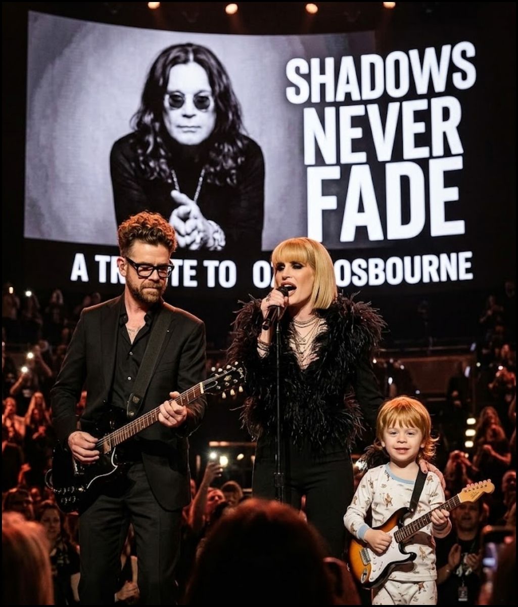 On a night meant for remembrance, something far more profound began to unfold. As the first gentle notes of “Shadows Never Fade” echoed through the venue, Kelly Osbourne, Jack Osbourne, and young Sidney stepped forward together. They did not walk with the confidence of performers. They moved with the quiet gravity of a family carrying something unfinished, something too important to leave unsaid.
