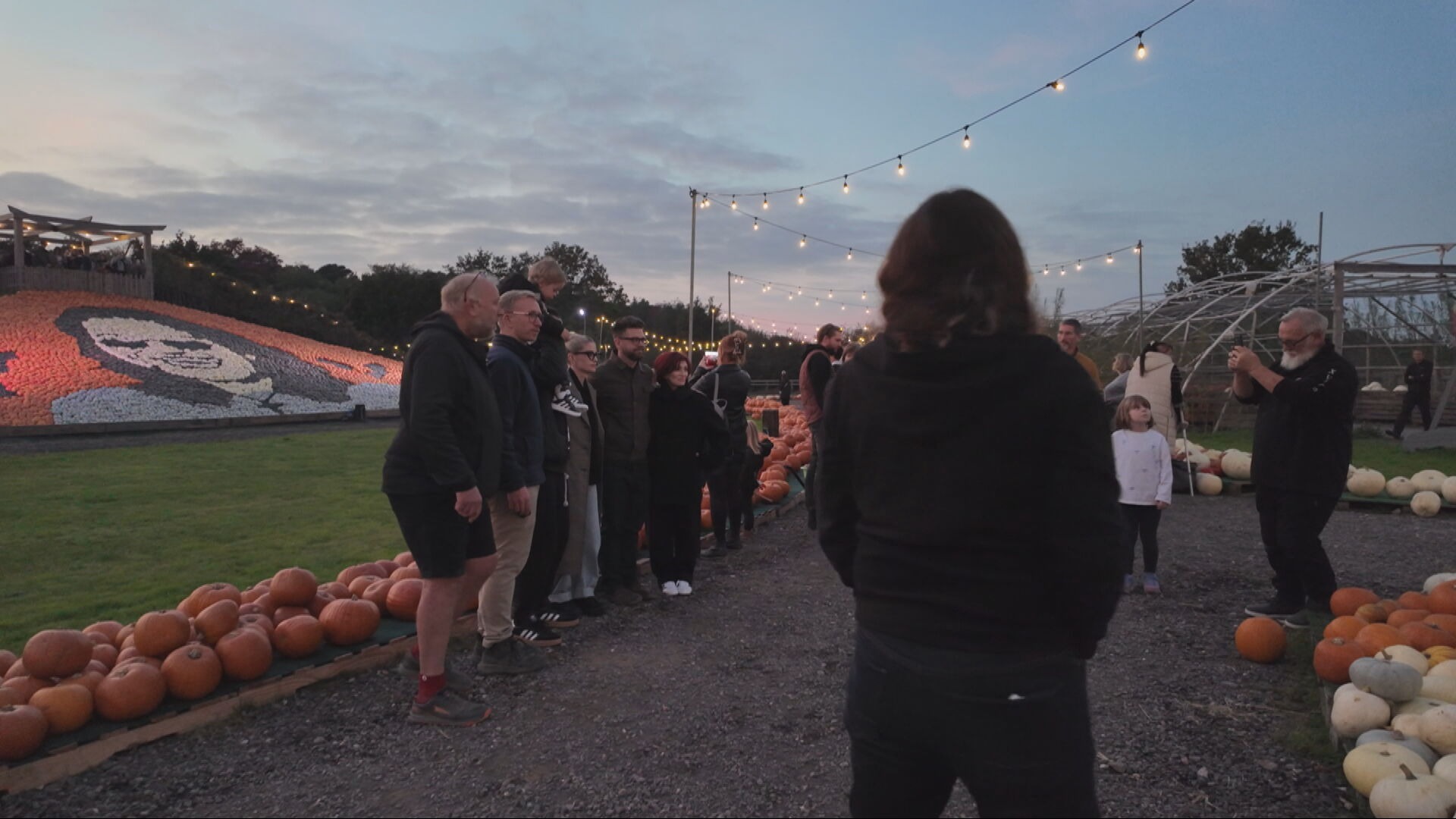 💬 “He would’ve loved this,” Sharon murmured, her voice barely above a whisper as she stopped before the centerpiece — a towering mural of Ozzy’s face, created from over 10,000 pumpkins and squashes. The likeness was extraordinary. His eyes, shaped from dark gourds, seemed to shimmer with life. The grin — mischievous, familiar — glowed as the setting sun struck the orange canvas behind it. The tribute, chosen by public vote, was both grand and humble: a portrait made not of stone or steel, but of earth and harvest, of things that grow and fade and return again.
